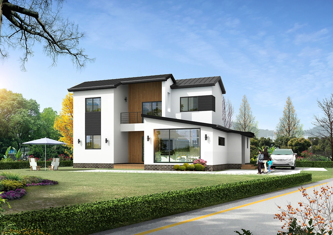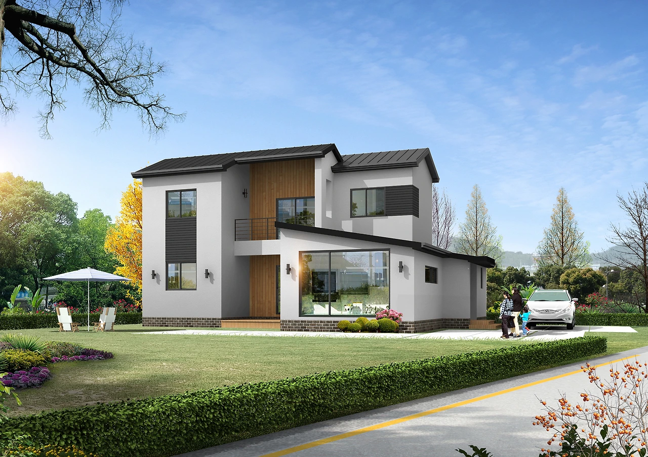 단순히 박스형 입면이 아닌 경사각과 발코니, 포치 등을 전면부에 적절히 활용하여 많은 비용을 들이지 않더라도 훌륭한 모던 주택을 탄생시킬 수 있도록 하였습니다.^^