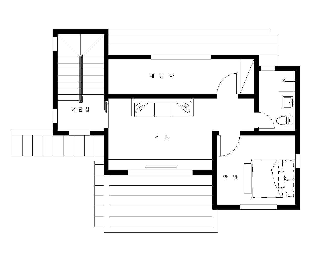목조주택에 발코니를 설치할 때에는 필수적으로 지붕을 씌워줘야 합니다. 직사광선을 피하셔야 하며, 발코니 위에 지붕을 시공하여 혹시 모를 누수에 대비하셔야 합니다. 간혹 지붕이 없는 것이 이쁘다고 무조건 해 달라고 하시는 분들이 계신데 이는 위험한 행동입니다. ^^;