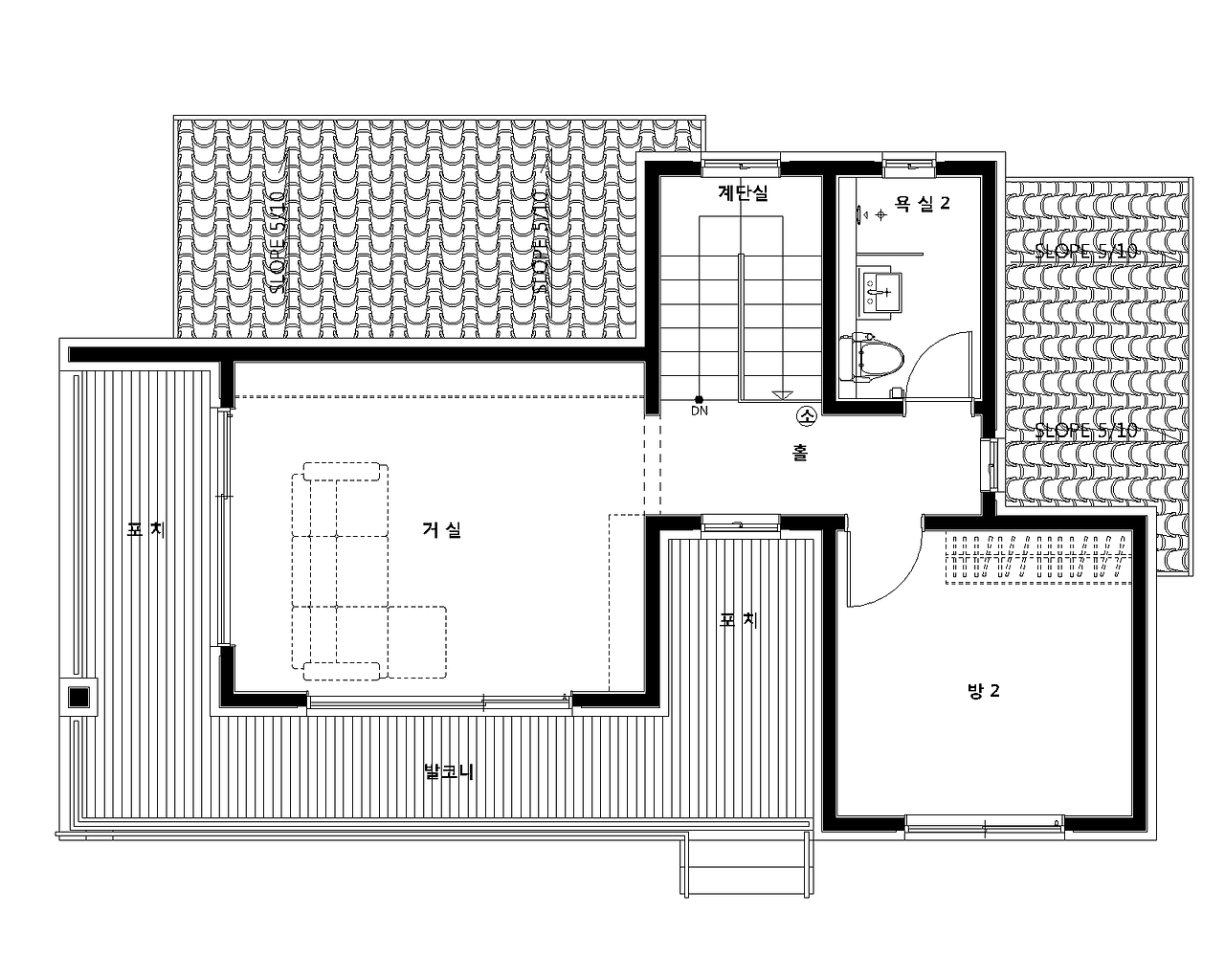 집의 특징이라고 할 수 있는 부분은 2층의 넓은 지붕형 발코니인데요. 옥상이 없는 대신 2층 발코니를 넓게 구성하여 다목적으로 활용이 가능하도록 설계하였습니다.^^