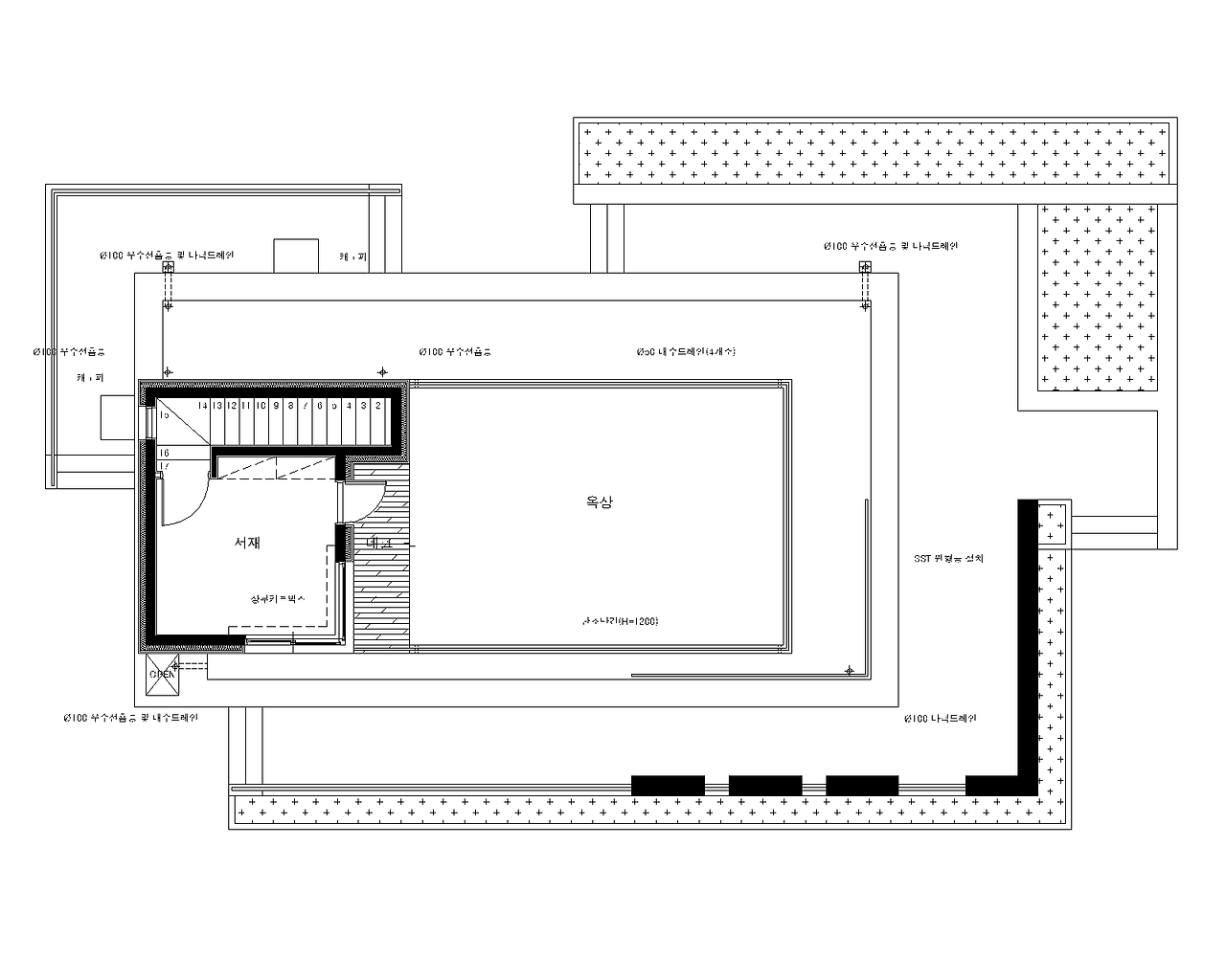 일반적으로 제 설계에는 옥상을 잘 안 만드는데요. 이번 경우에는 철근콘크리트 공법에 시트방수라는 것을 적용하여 최대한 누수에 대한 위험을 잡은 케이스라 할 수 있습니다.