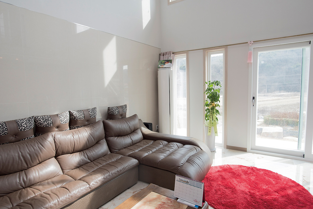 거실 바닥을 대리석 타일로 마감해 고풍스러운 느낌을 배가시킨다.