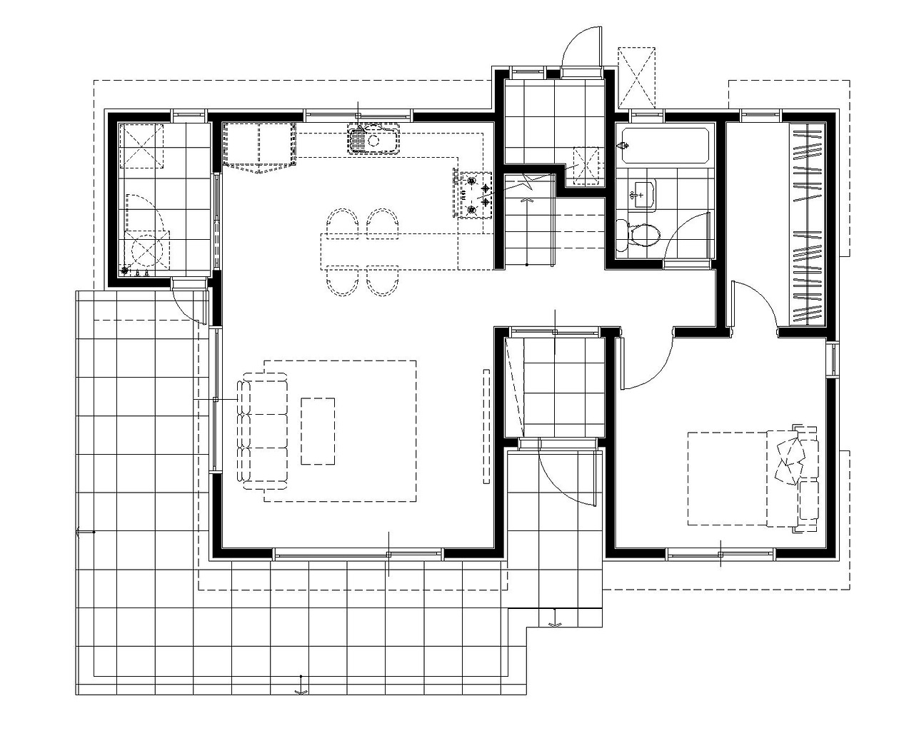 임성재 건축가 : 작은 평수이기 때문에 거실 주방이 답답할 염려가 있었어요. 그래서 1.5층 오픈 천장을 적용해 현관에서 진입했을 때 넓은 개방감을 느낄 수 있게 설계했습니다.