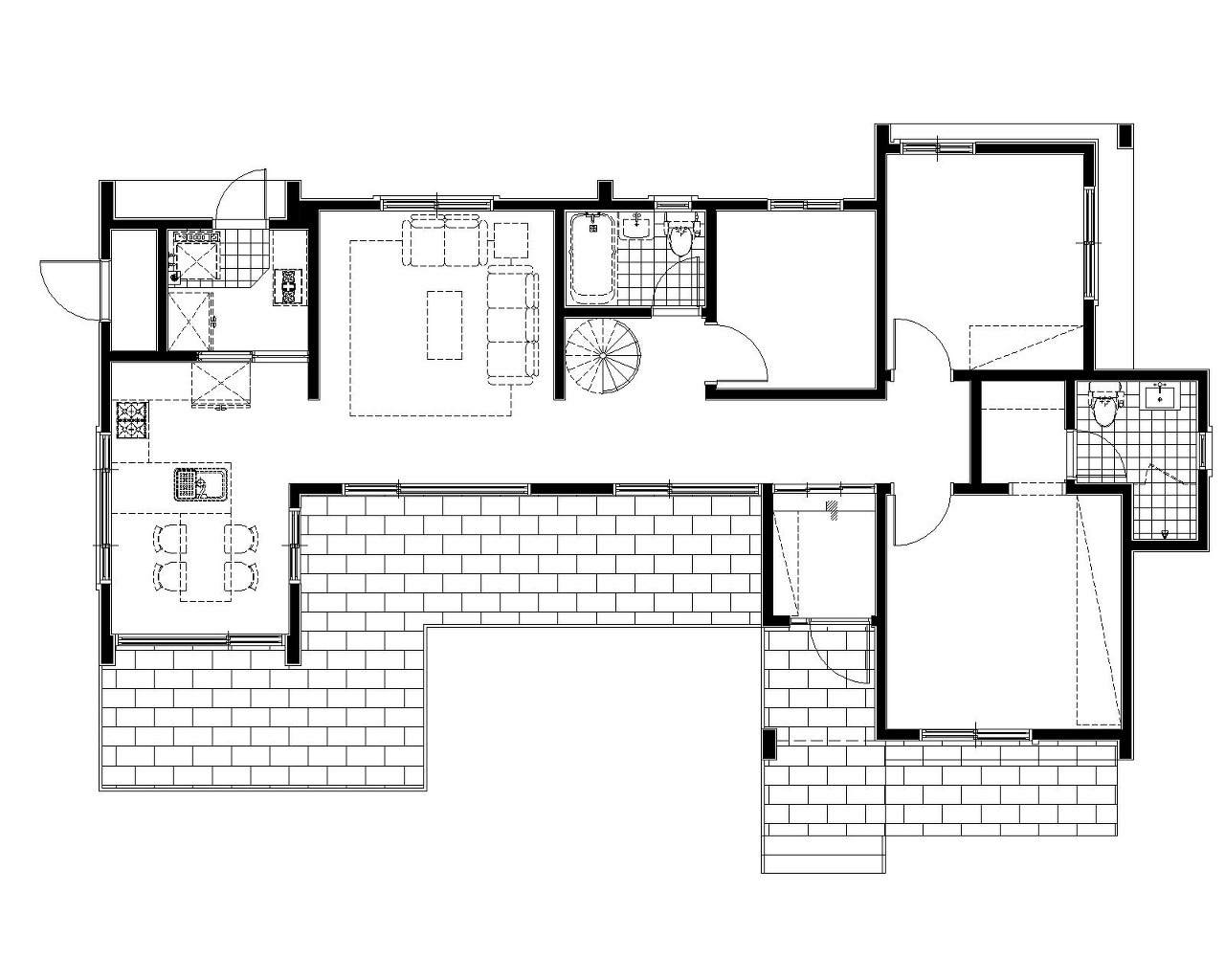 임성재 건축가 : 'ㄷ'자형 주택이 흔하지는 않죠. 거실과 방을 복도라는 공간에서 구분하면서 자연스럽게 'ㄷ'자형 배치를 만들어 냈습니다. 전면부 데크를 설치하여 외부로의 동선 확장을 유도하였으며, 다락으로 올라가는 계단실 면적을 줄이기 위해 원형계단을 사용해 안정감과 자리를 적게 차지하는 부분을 만족시켜주었습니다.