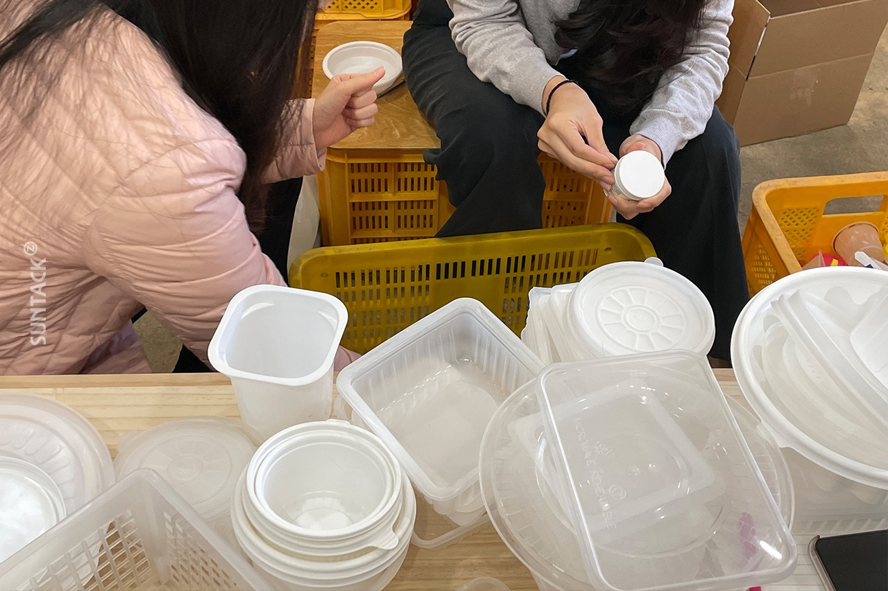 PP성내에서는 PS, PP, PE, PET 이렇게 네 가지 종류의 플라스틱을 수거합니다. PS, PET는 해당 재활용업체로 보내고, PP, PE는 색상별로 분류해 분쇄 후 새로운 제품으로 탄생시키는 작업공간으로 보냅니다. 말은 쉽지만... 이렇게 재활용품을 작업장으로 보내기 전 플라스틱 종류가 섞이지 않게 재질을 다시 확인하고, 색상별로 분류하고, 라벨이 붙어 있는 건 떼어내는 작업을 한답니다.