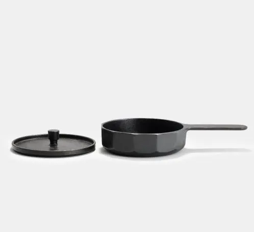 한식 전문 무쇠 브랜드라고 자부하는 무쎄. 실제로 냄비나 웍이 가마솥을 연상케 하는 디자인들이 많다. 무쎄는 10년간 에나멜 코팅을 다시 입혀주는 '라이프 리컨디셔닝 프로그램'을 자체 운영하고 있다. 제품 사이즈마다 3~5만 원대 가격으로 하나의 팬을 오랫동안 사용할 수 있다. 이 프라이팬은 안정감 있는 Y자 손잡이와 플랫한 디자인이 맘에 든다. 팬의 벽과 바닥이 거의 일자로 떨어지고 3cm의 낮은 깊이라 식빵 구울 때 제격일 듯- 모서리가 둥근 아이들은 그 부분만 식빵이 노릇해지지 않거나 빵끝이 탄다고요.