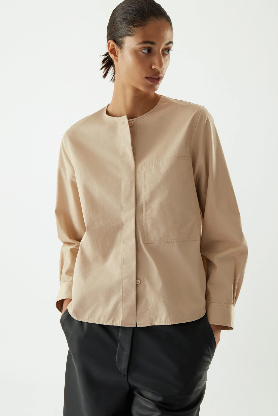 그랜대드 칼라 패치 포켓 셔츠는 역시 하나쯤 가지고 있으면 좋은 기본 아이템. 단추가 숨겨져 있고 칼라가 없는 디자인이 역시 미니멀하다. 정장에도 캐주얼에도 편하게 입을 수 있는 스타일.