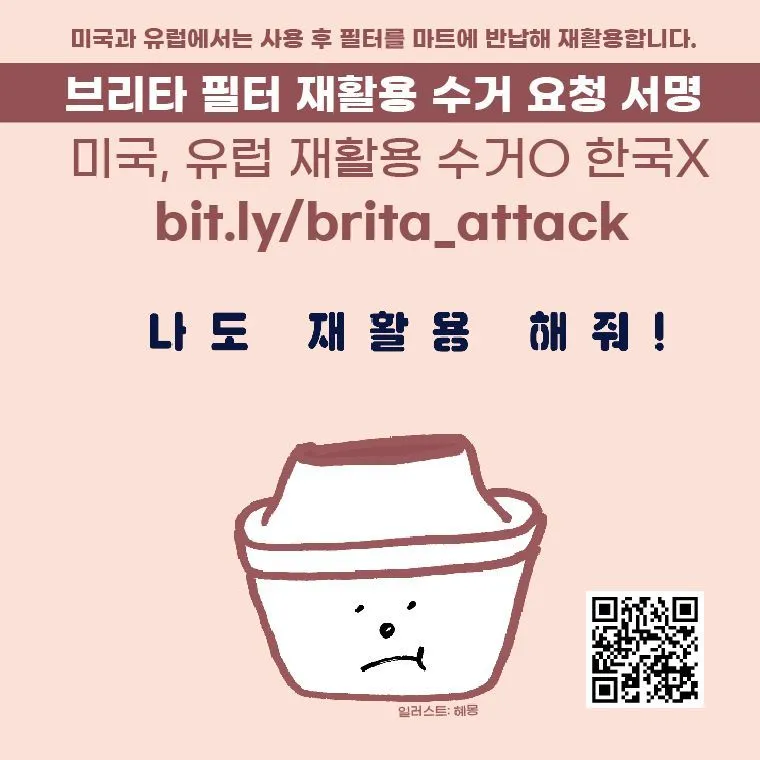 버리기가 어려워 버리지 못한 필터가 하나둘 쌓이기 시작할 때 접한 ‘브리타 어택 캠페인’ 소식은 반가울 수밖에 없었다. 브리타 필터 수거와 재활용 프로그램을 브리타코리아에 요구하기 위해 온라인 서명을 받고 폐 카트리지를 수거하고 있다니! 필자와 같은 고민을 하고 있던 브리타 사용자가 한두 명이 아니었던 것이다. 캠페인을 지지하고 참여하는 이들에게 동지의식이 느껴졌다. 게다가 독일, 영국, 아일랜드 등에서 이미 운영 중인 재활용 시스템이 한국에는 없다는 사실에 분노하지 않을 수 없었다.