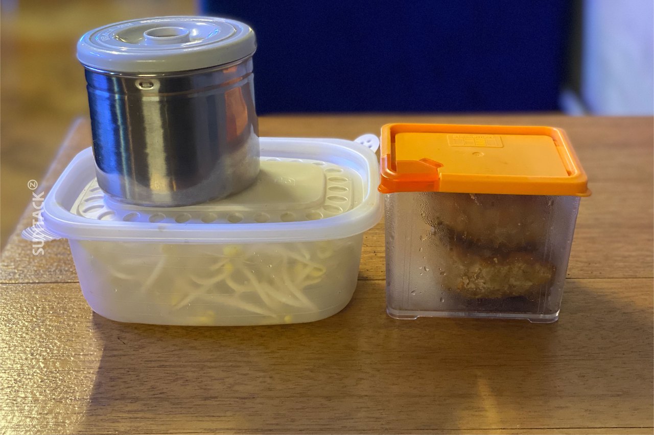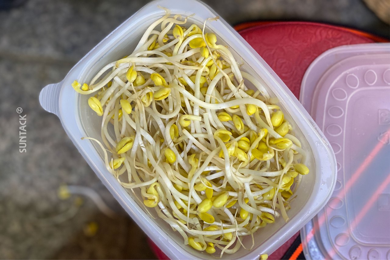 국에 넣을 콩나물을 사러 야채가게에 갔다. 가게 사장님께 콩나물을 달라고 하자 콩나물을 비닐 안에 담아 주려했다. 나는 준비해온 플라스틱 용기를 꺼냈다. 콩나물 천 원어치를 담으려고 했는데 용기가 작아 다 들어가지 않았다. 콩나물을 용기에 눌러 담고 남은 콩나물은 덜어냈다. 개인 용기가 작아 콩나물을 다 담지 못했지만 국에 넣을 양으로는 충분했다.
