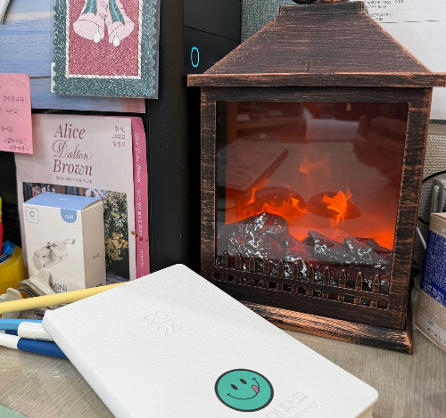 사무실 책상 한편의 모닥불 조명을 한참 쳐다보기도 한다.