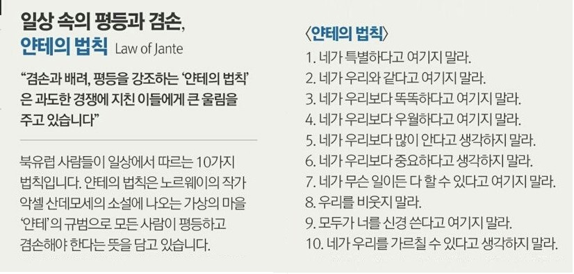 영상을 보지 못한 분들을 위해 내용을 간단히 요약하자면, 우리나라의 장유유서처럼 이들에게 어릴 적부터 당연히 받아들여오는 "얀테의 법칙"이 있다고 한다.