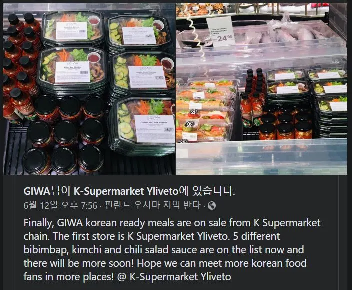 게다가 최근에는 GIWA라는 핀란드 한식당에서 Yliveto 지역의 k-market에 5개 종류의 비빔밥, 김치, 칠리 샐러드 소스를 선보이기도 했다. Yliveto에서 인기가 많다면 점점 한식을 다양한 k-market 지점에서 볼 수 있을 것이다.