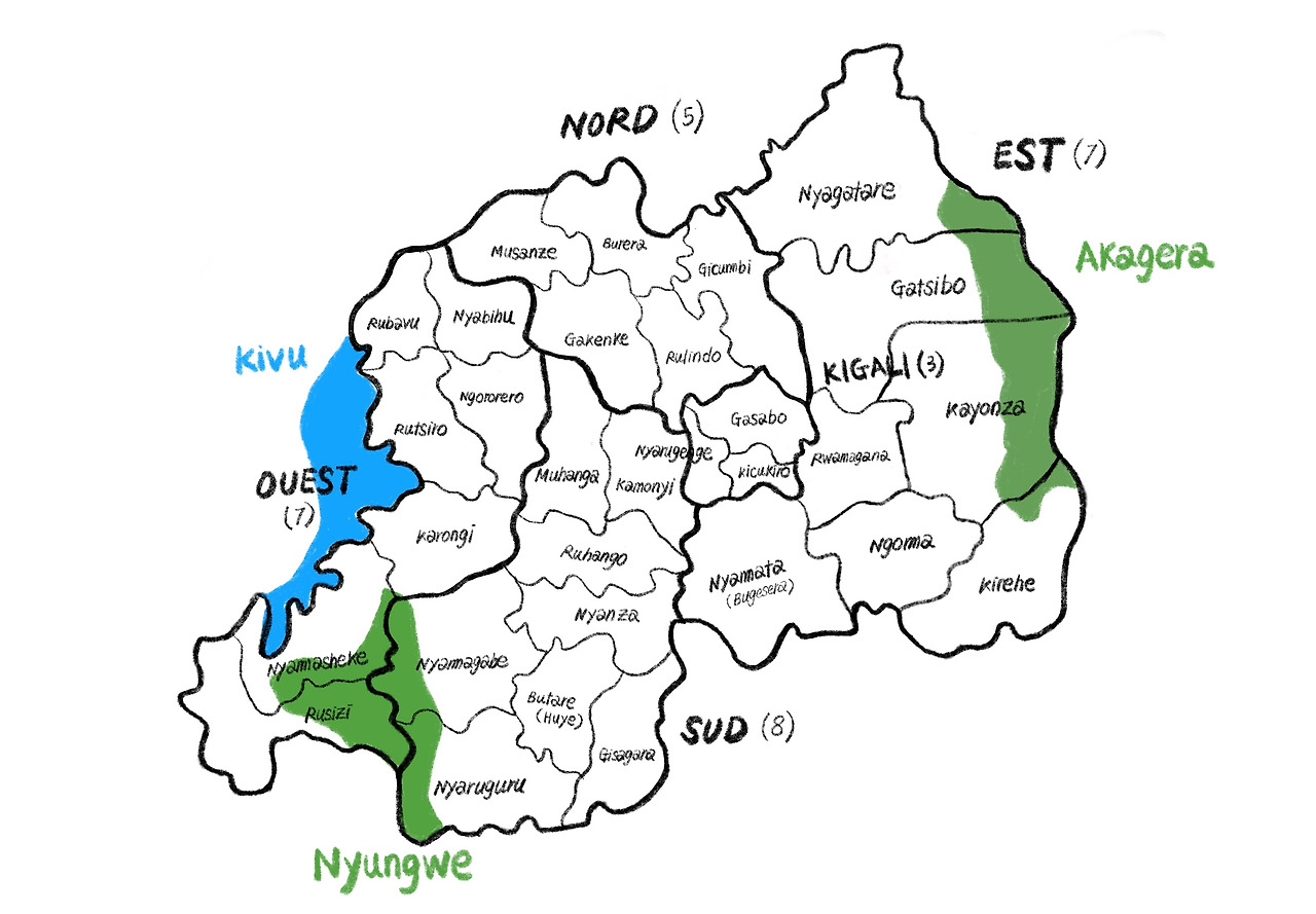 우선 르완다는 도시 계획을 통해 네 개의 주(provinces)와 수도인 키갈리(Kigali)로 나뉘고, 각 주는 총 30개의 구역(district)으로 구분된다. 이렇게 구분된 구역은 더 작은 행정단위인 섹터(sector), 셀(cell), 마을(village)로 세분화된다. 아래는 내가 공부차원에서 르완다 전역의 지도를 그린 것이다. 출장 목적으로 르완다를 방문한 사람이라면 키갈리와 파견지 이외에 다른 지역을 방문할 기회가 많지는 않겠지만, 혹시나 하는 마음에 공유해 본다.