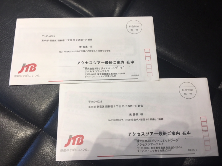 그렇게 기분좋게 휴가만을 기다리고 있는차, 투어버스 업체에서 도착한 메일이 나를 멘붕에 빠뜨렸다. 숙소를 신주쿠에 잡고 직통버스로 공연장으로 오갈 예정이었는데, 주소를 잘못 적어 반송처리가 되었다는 소식이... 급하게 예약한 숙소 주소를 다시 보내주고 그 다음주에야 호텔로부터 해당 버스표를 수령했다는 소식을 접수. 그래도 혹시나 누락이 되면 어쩌나 하는 걱정이 앞섰지만, 당일 호텔에 체크인을 하자 바로 직원분이 봉투 두 장을 건네주었다. 그것은 바로..