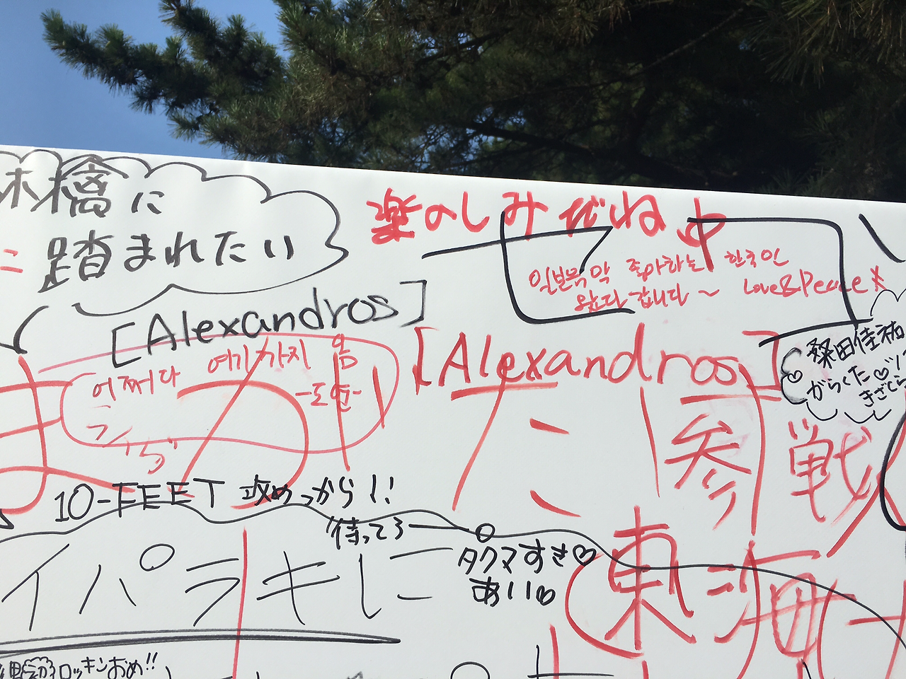 아, 그리고 인상적인 것 또 하나. 그 많은 사람들 중에, 핸드폰으로 무대를 촬영하는 사람이 정말 단 한명도 없었다.(각 잡고 찾으면 뭐 몇명은 있었겠지만...) 물론 촬영자체가 금지사항이고, 허구헌날 공연을 하는 팀들이라 희소성 자체가 상대적으로 떨어져서 그런 것일 수도 있겠지만, 좀처럼 출연하지 않는 비즈나 쿠와타 케이스케의 공연에 조차 카메라를 들지 않는 모습은 좀 놀라웠다. 물론 그들도 트위터나 라인 계정에 페스티벌에 대한 감상을 남기곤 하지만, 그것이 - 영상이나 사진을 배제한 - 타인을 향한 '보여주기'로의 선을 넘지 않는 모습으로 하여금 '즐김'의 지향점이 자신에게 향해있음을 알 수 있었다. 그 시간만큼은 오롯이 자신과 주위 사람들을 위한 영역으로 남겨두는 관객들의 이 애티튜드야말로, 페스티벌이 성공적으로 운영될 수 있는 가장 큰 원동력이라고 느껴지는 부분.