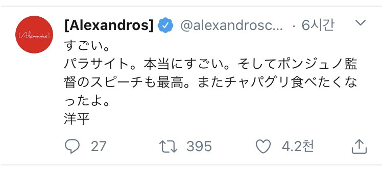 ps. 새삼스럽게 오늘 요헤이가 기생충의 수상에 대해 남긴 트윗이 있어 공유합니다. 같이 축하해줘서 고마워요!