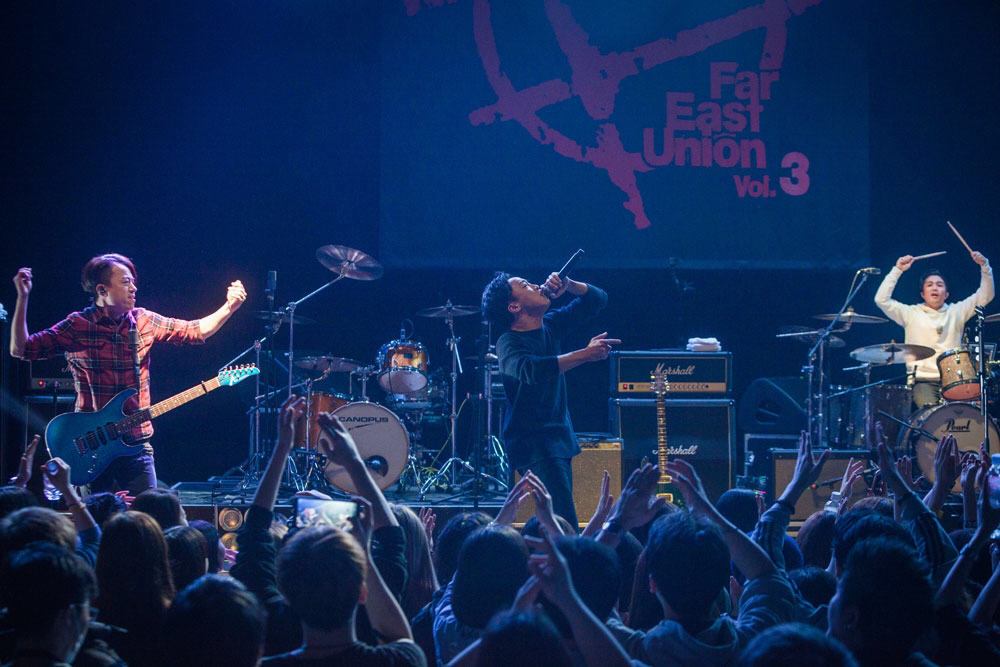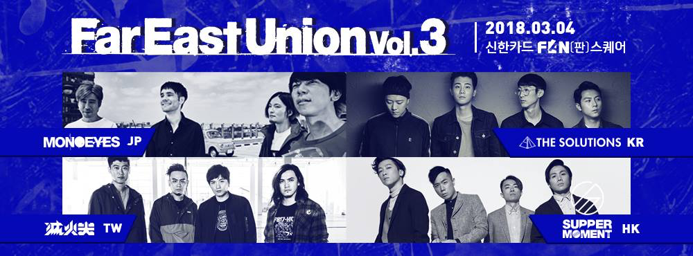 혹시 < Far East Union >이라는 타이틀을 들어본 적이 있는가. 2015년에 처음 시작된 본 공연은, 국가간 교류와 우호를 목적으로 동아시아의 밴드들이 의기투합해 투어를 진행하는 일종의 '음악외교행사'다. 2016년 시즌 2 이후 소식이 없어 그 명맥이 끊기는가 했지만, 다행히 연초가 되자마자 시즌 3가 발표. 기존 한국과 일본, 대만에 이어 이번엔 홍콩까지 가세, 총 4개국 뮤지션의 참가로 더욱 기대감을 고조시키는 소식이었다. 비가 부슬부슬 오던 지난 3월 4일 아침, 합정 신한카드 FAN 스퀘어 홀엔 4개국 대장정의 출발을 목격하기 위한 이들로 북적였다. 엘레가든 출신인 호소미 타케시의 모노아이즈(MONOEYES)가 첫 주자로 예정되어 있어서 그런지 아티스트의 굿즈를 입은 팬들이 인산인해를 이루고 있었다. 이윽고 모노아이즈가 등장해 'Free throw'를 선사. 이어 'Run run'과 1집 프로모션 곡 'My instant song'을 이어가며 기세 좋게 포문을 열었다. 사실상 파이어 엑스(Fire-EX)와 함께 호스트를 겸하고 있는 모노아이즈의 호소미 타케시는 "오프닝을 맡아서 기쁘다."며, "위대한 페스티벌에 함께 해주셔서 감사하다."고 이야기 했다. 그리고 "한국과 일본, bad relationship, 대만과 홍콩, bad relationship, but We don't give a fxxk!"이라는 멘트로 환호를 이끌어 냈고, "당장은 어려울지라도 이렇게 시작함으로서 우리의 자손들은 언젠가 진정한 친구가 될 수 있을 것이다."라며 'Two little fishes'를 열창했다. 이 순간이 바로 이 이벤트가 무엇을 말하려 하는지에 대한 모범답안이었다.