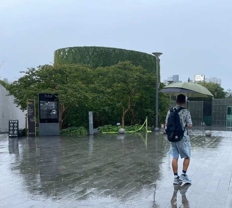 비 올 때는 미술관이니까, ACC에 갔다. 어제 본 두 건물 사이로 들어서니 아래로 내려가는 계단이 있고, 그 아래로 건물들이 숨어있었다. 이제야 ACC의 건물구조를 이해할 수 있었다. 이후에 만나게 될 도슨트에 따르면, 이 건물은 10년 동안 땅을 파서 만들었다고 한다. 아래로 내려가는 구조이니 지붕이 그리 낮은 거였다. 둥근 건물 외벽은 온통 푸른 생명으로 뒤덮여 있었다. 잘 자랐다. 부산현대미술관 관계자가 보고 배웠으면 좋겠다. 이어 계단을 더 내려가자 비에 씻겨 더욱 매끈한 껍질을 자랑하는 배롱나무들이 초록을 진하게 뿜어내며 계단 양쪽에 도열해 있었다. 우리 아파트의 가장 번화한(?) 사거리를 점령하고 있는 것도 배롱나무로, 아파트 식생 중 가장 늦게 잎이 나고, 꽃도 늦게 펴서 일 년 내내 헐벗은 모습으로 서있지만, 한번 꽃이 피면 그 압도적인 존재감에 다들 경탄을 금치 못한다. 한 번도 배롱나무의 꽃, 흔히 백일홍이라 불리는 붉은 꽃의 꽃말을 궁금해한 적이 없었는데, ACC에서는 그게 참으로 중요했나 보다. 친절하게 꽃말까지 나무 옆에 적어두었다.