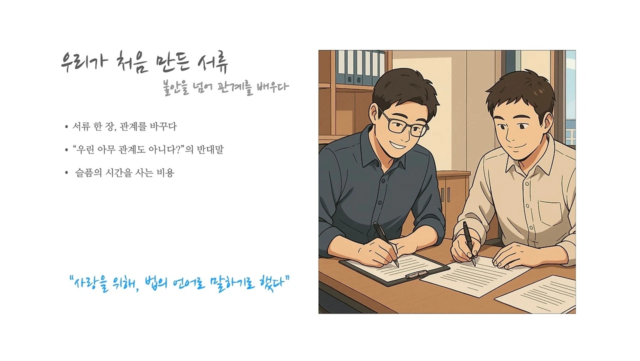 저희는 결국 '재산공증' 문서를 만들었고, 그게 우리가 처음으로 만든 공식 서류였습니다. 종이 몇 장인데도 ‘우린 이제 아무 관계가 아닌 게 아니다’는 든든함이 생기더군요.