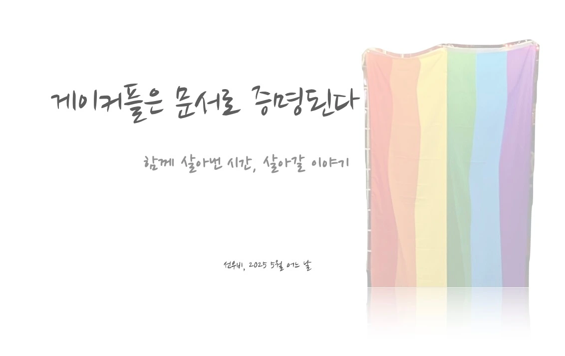 "그냥 살아온 이야기만 해도 누군가에게 도움이 된다"는 말에 용기 내 이 자리에 섰습니다. 긴 얘기지만, 핵심은 하나예요. 성소수자로 오래 사는 것도, 함께 사는 것도 가능한 일이란 걸 보여드리고 싶었습니다.