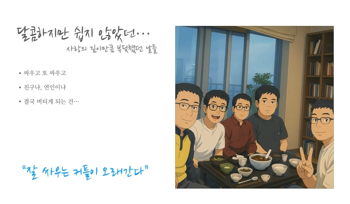 서울-부산 장거리였고 띠동갑이라 가능성이 없다고 생각했지만, 결국 제가 먼저 고백했고, 1년 뒤 제가 부산으로 내려가 동거를 시작했습니다. 정말 예상치 못한 곳에서 인연이 생길 수 있다는 걸 그때 배웠어요.