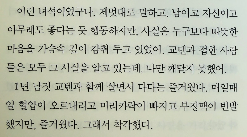 “어른이 되면 친구도 지인도 아닌, 미묘한 관계의 교제가 늘어난다. 보통 같으면 교텐을 ‘같이 일하는 동료’로 분류할 수도 있겠지만, 교텐은 보통이 아니어서 그것도 딱히 맞지 않는다.”