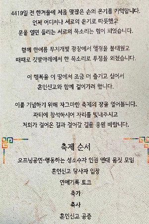 식순을 보니까 나중에 동성결혼 합법화를 대비해서 혼인신고 공증을 하는 절차까지 있는 등, 상당히 재미있어 보였어요.