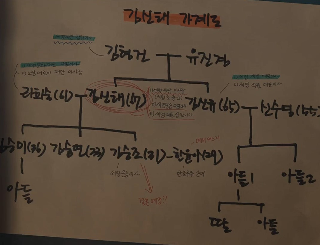 올해 67세의 세명재단 이사장 김신태씨는 동은이 작성한 가계도에 따르면 부인 라희숙 사이에서 3명의 자녀를 둔 유부남 게이로 설정되어 있다.