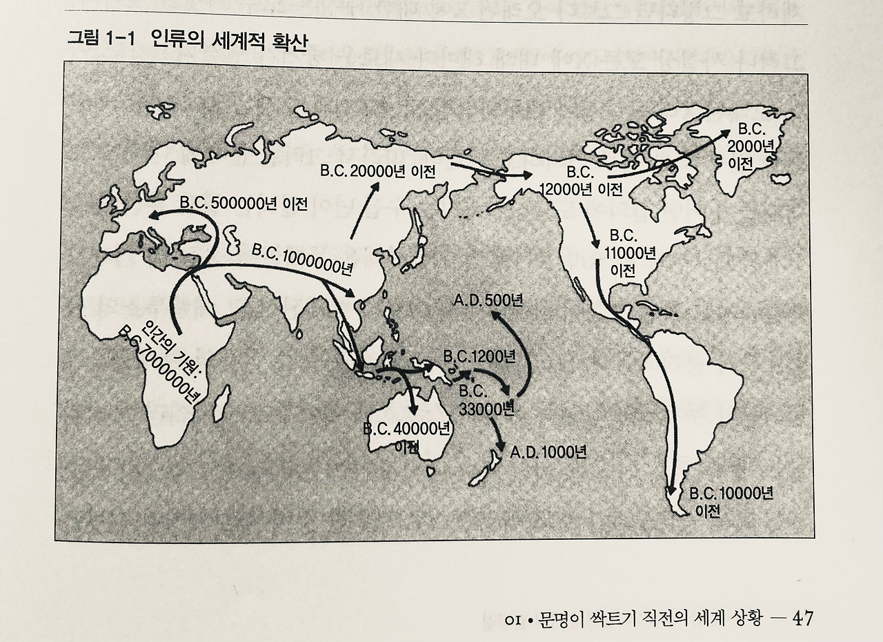 이처럼 대륙마다 인류가 살기 시작한 시기는 각각 다르다. 하지만, 인류가 먼저 살기 시작했다고 해서 문명 발달에 이점을 준 것은 아니라는 점은 이 책(총 균 쇠)의 설명과 현재 세계의 불평등을 보면 알 수 있다. 또한, 우리는 유라시아의 문명 발달이 가장 빨랐다는 것을 안다. 그렇다면, 왜 유라시아 문명이 더 빠르게 발전할 수 있었을까? 그 원인은 무엇일까?