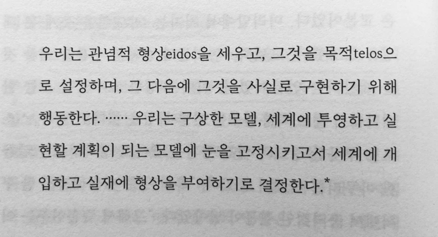 서양적 효율성의 기반은 '모델화'다. 모델화란 실현하고자 하는 대상을 관념적으로 먼저 구상하고, 그 후에 의지와 행동을 통해 관념적 구상을 현실 속에 구체화하는 구도를 말한다.(18) 쉽게 말해서 이론/실습, 목적/수단, 사유/행동, 계획/실천과 같은 구조를 통해 목표 대상을 실현해나가는 것이다.
