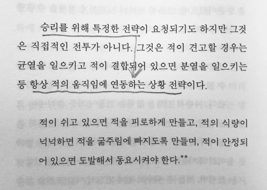 형세가 드러나면 승자와 패자가 결정난다. 적을 알고 나를 알면 백전백승은 이러한 의미다. 전쟁을 잘하는 자들은 모두 이길 수 있는 객관적 조건을 다 갖추고 있다. 이들은 직접적인 공격을 하지 않는다. 그저 객관적 조건을 유리하게 만든다. 물론 승리를 위해 특정한 전략이 요청되기는 하지만, 중요한 것은 항상 적의 움직임에 연동하는 상황 전략이다.(58) 그래서 쉽고, 피도 흘리지 않고, 눈에 띄는 장수가 없다.