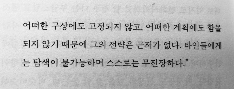저자는 서구적 효율성의 한계와 내적 문제를 독일의 전쟁 이론가 '클라우제비츠'의 관점을 빌려 설파한다. 전쟁은 본질적으로 상대방의 반응에 따라 변화하는 분야다. 전쟁은 항상 예견으로부터 이탈하고, 이론과 마찰이 생긴다. 때문에 균형을 다시 잡고 저항을 무찔러야 하는 상황이 늘 발생한다. 즉, 전쟁은 계획이나 이론처럼 진행되지 않는다. 이게 전쟁의 본질이자 개념이다. 그래서 모델화는 실재적 전쟁을 포착하지 못하며, 사유하지 못한다.
