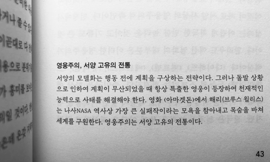 이러한 이유로 모델화는 필연적으로 영웅을 요청한다. 전쟁에서 이기려면 모델의 이탈 속에서도 상황을 극적으로 해결할 수 있는 천재적 능력을 가진 인물이 필요하기 때문이다.(44) 할리우드 같은 서구 문화에서 늘 영웅주의 플롯이 등장하는 것도 이 같은 이유다. 서구적 효율성은 계획과 목적을 치밀하게 세우고 강력한 의지로 실천에 옮기는 모델화 구도를 기반으로 한다. 하지만 모델화가 무산될 때 영웅을 요청한다.