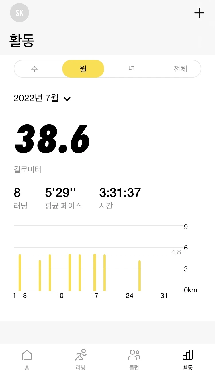 한 달 동안 총 8회 뛰었다. 기록을 보면 한 주에 2~3회씩 꾸준히 뛰다가 3주 차 이후부터 급격하게 줄었는데, 이유는 조깅을 풋살로 대체했기 때문이다. 7월 중순부터 목요일 야간 풋살모임에 가입하게 되면서 조깅 대신 풋살을 즐기게 되었다.