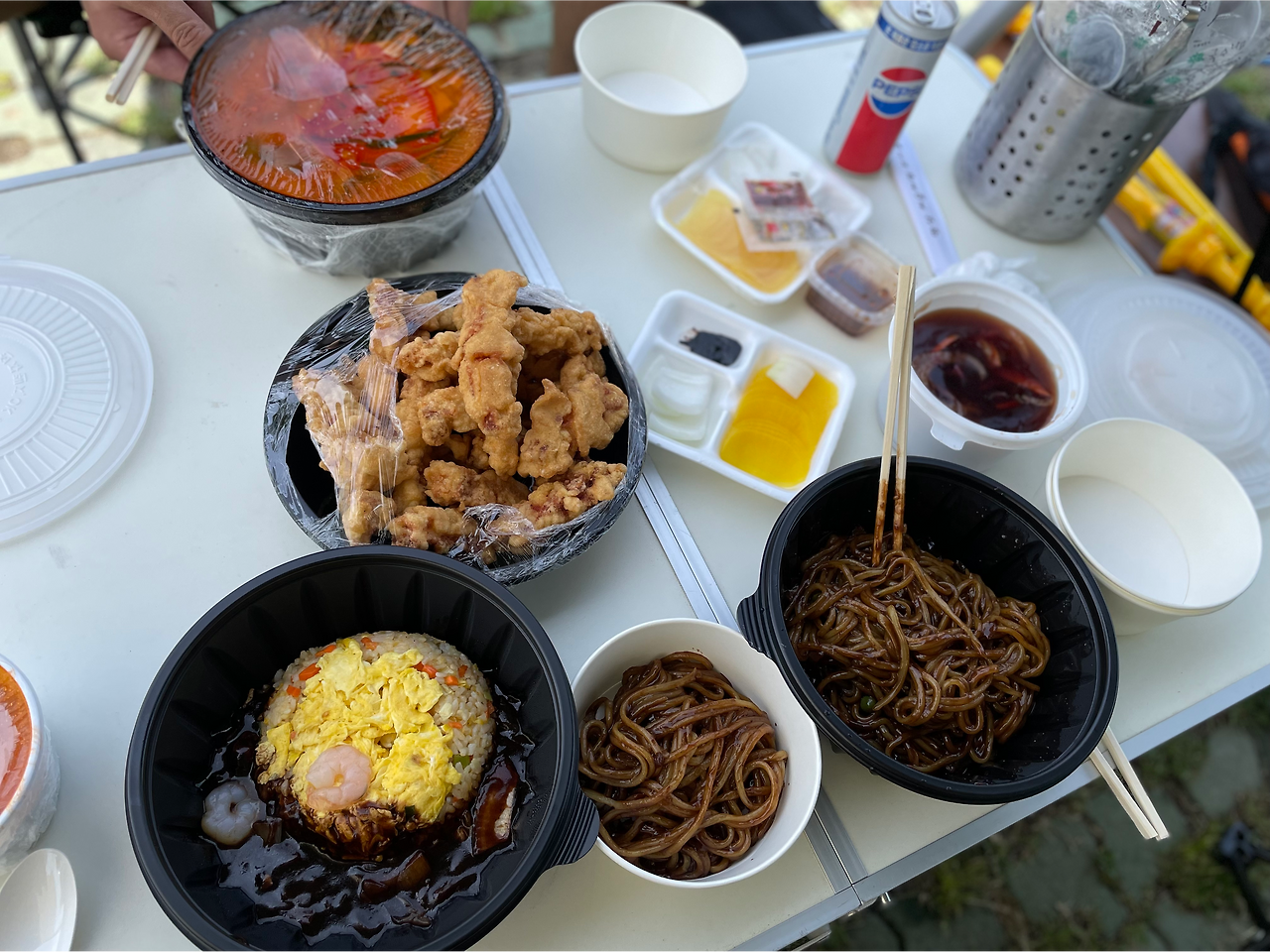 겨우 어닝을 펼치고 그늘막까지 세팅 한 뒤, 테이블과 의자를 꺼내려니 마침 식사가 도착했다.