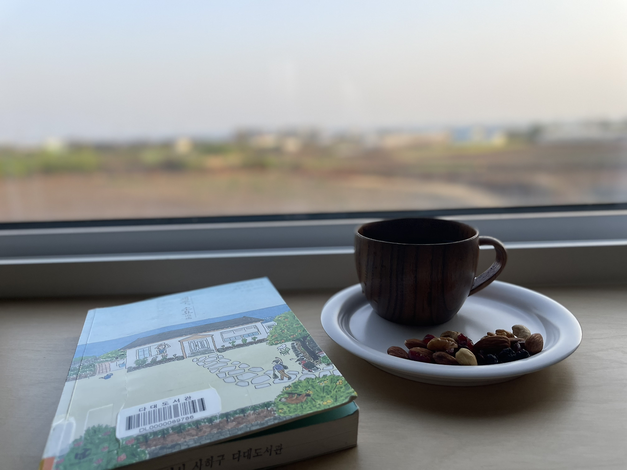 하지만 그 와중에도 어떻게든 나를 찾고자 하는 찰나를 느끼고 싶어 여행을 갈 때는 늘 책을 가져가고 있다. 이번 여행에는 <제주, 소요>라는 책을 가져갔다. 여유 없는 관광을 하는 나에게 제주로 이제 막 이주하여 느긋하게 진짜 제주를 느끼는 작가의 사진과 글이 부럽기만 하다. 조금이라도 책에 공감하고 싶어서 여행 일정 중 혼자 새벽시간에 책을 펼쳤다. 아직 남편과 아이들이 잠에서 깨지 않은 고요한 시간, 드립백 커피에 견과를 챙겨 창가에 앉아 책을 읽는 그 시간이 좋았다.