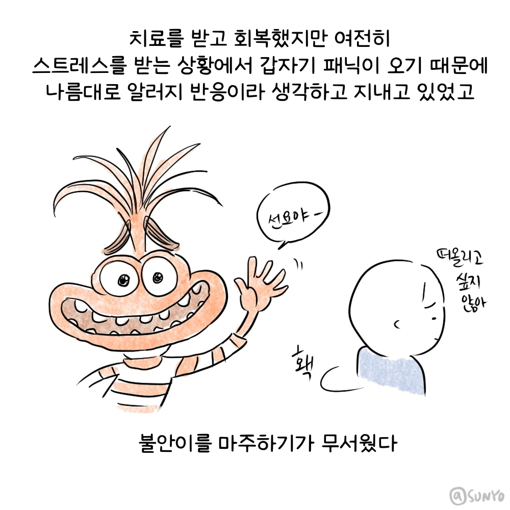스트레스 받는 상황이 오면 또 공황이 오기는 해도 지금은 일을 하지 않고 있어서 괜찮고 제가 겪어왔고 알기에 조금은 대비할 수 있어 다행이라고 생각해요.