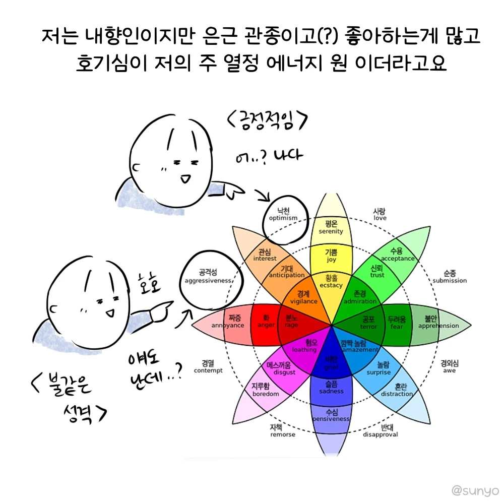 예를 들어 슬픔 이의 경우 조금 더 깊은 감정을 느끼고 연민, 공감을 잘할 수 있다고도 생각하고 진중하고 섬세하고 차분한 면이 있다고 생각해요.