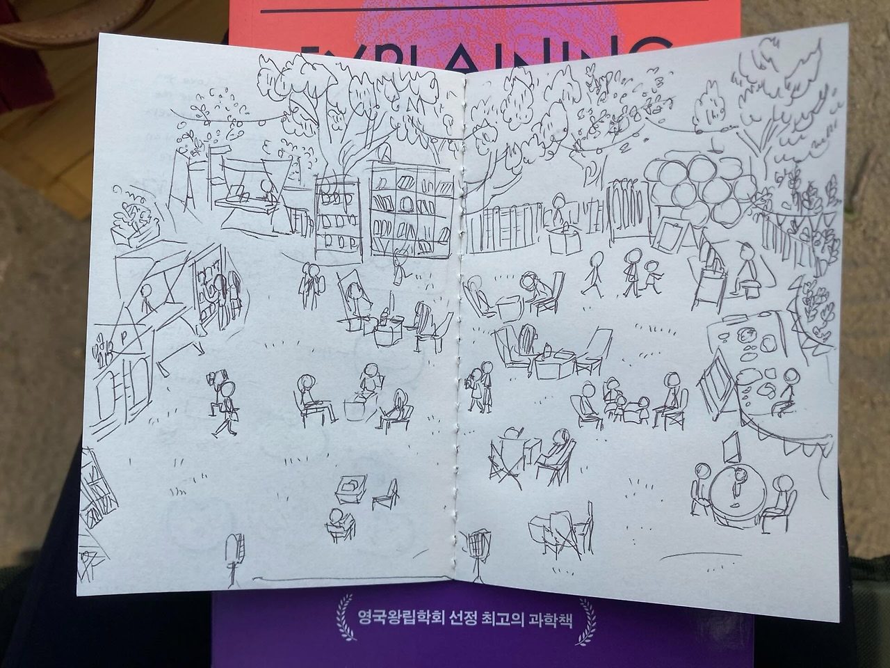 자극을 많이 주고 영감을 받으려고 노력한다. 지난 주말에는 '장 줄리앙의 종이세상' 전시를 보고 왔고 어제는 서촌에서 하는 '열린 책장&독서촌 : 서촌의 책장'을 다녀왔다. 집에 콕 박혀 작업을 하는 것도 좋지만 다른 작가님들의 작품을 직접 보고 세상과 사람들과 교류하며 작업을 하고 영감을 받아야겠다는 다짐을 했다. 개인적으로 장 줄리앙의 종이세상은 짧았지만 임팩트가 있어 좋았다. 아이들이 굉장히 좋아할 거 같다는 생각이 들었고 아이들과 이런 걸 보고 얘기 나눠보고 미술 수업을 해보고 싶다는 생각도 들었다. 사실 아이들을 보다가 안 보니 너무 그리워져서 내년에는 다시 아이들과 일 할 수 있는 기회를 짧게나마 만들어 보려고 한다. 그리고 서촌의 책장에서는 가서 전체 이벤트의 러프 스케치도 해보고 이전에 읽어보고 싶었던 책도 발견하여 읽었다. 나는 내가 늘 비주류에 속한다는 생각이 들어 이런 비주류 사람들이 만들어 내는 창작물과 글을 좋아한다. 읽다가 개인적으로 너무 맘에 들어서 도서관에 희망 도서 신청을 해두었다. 아무리 마음에 드는 책이라도 늘 도서관에서 한번 읽고 구매하는 습관이 있다. 이러지 않으면 집이 책으로 가득 차버릴 것 같아서 위험하다.