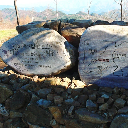 대간길을 따라 좀 더 위로 올라갔더니, 이번에는 울타리가 허물어진 것이 아니라 아예 설치되지 않은 구간이 나타났다. 거기에는 굉장히 멋진 표지석이 있었는데 '3대강 (한강, 낙동강, 오십천) 의 분수계' 를 알리는 표지석이었다.