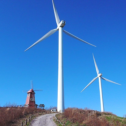파아란 하늘 아래 흰색 풍력발전기