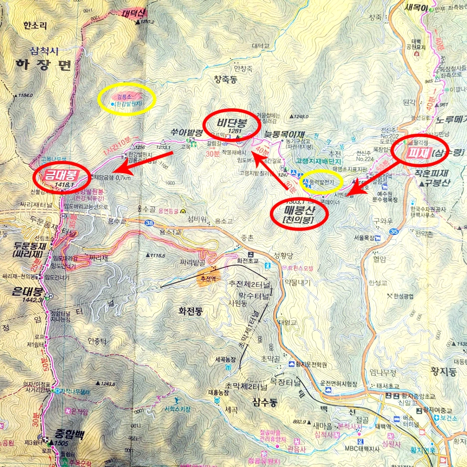 진행 구간 : 피재, 삼수령(강원도 태백)-매봉산-풍력발전기-비단봉-금대봉(강원도 태백)