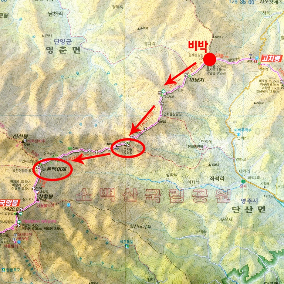 진행 구간 : 고치령 1.9km 비박(충북 단양과 경북 영주의 경계)-마당치-연화동 삼거리-늦은맥이재(충북 단양과 경북 영주의 경계)