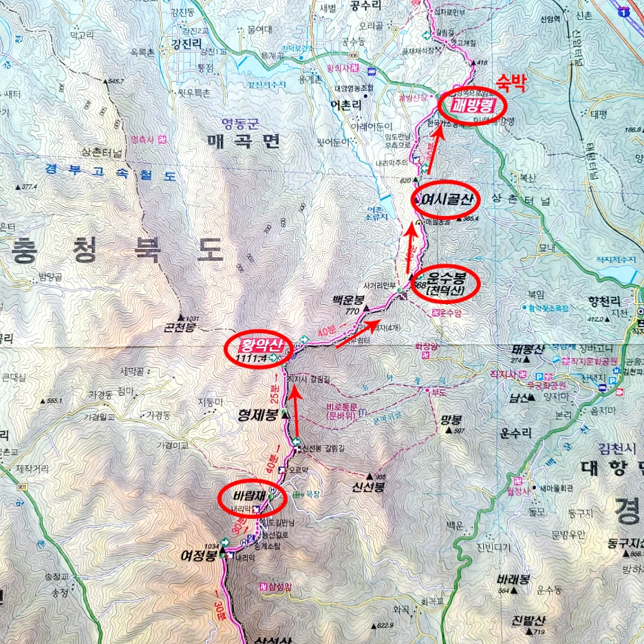 진행구간 : 바람재(충북 영동과 경북 김천의 경계)-황악산-운수봉-여시골산-괘방령 숙박-산장에서 하루 통으로 쉼(충북 영동과 경북 김천의 경계)