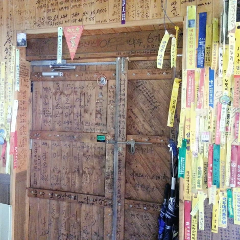 실내의 따뜻한 온기와 맛있는 음식 냄새가 추위에 젖은 나를 감쌌다. 한쪽 벽에는 그동안 다녀간 산꾼들의 등산리본과 뱃지들이 빽빽했고, 다른 공간에는 드럼과 기타와 키보드가 놓여있었다. 그리고 한 잔 드신 어떤 어르신이 일렉트릭 기타를 연주하고 있었다.