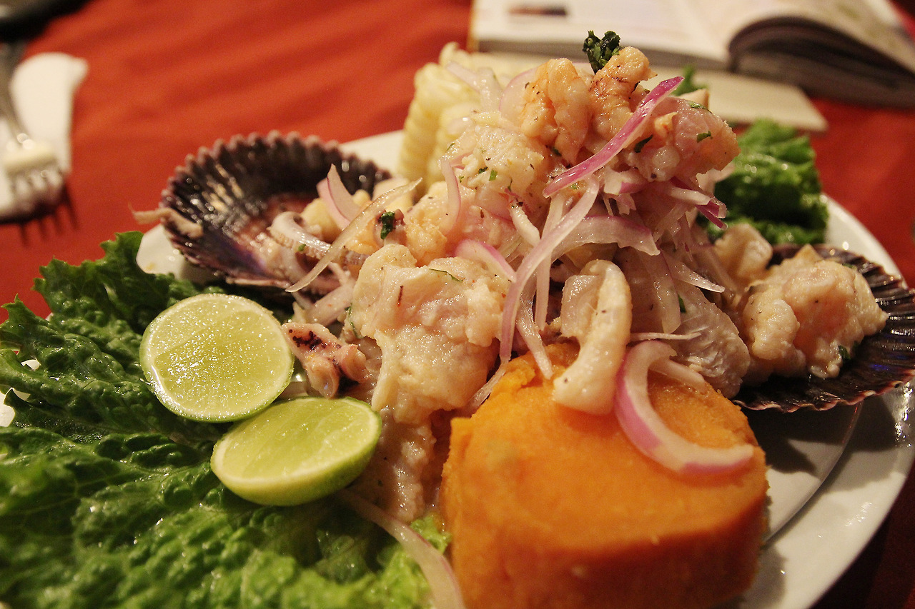 또 페루 하면 빼놓을 수 없는 페루 전통주 피스코(Pisco)와 회무침 세비체(Ceviche). 피스코는 포도주를 증류해서 만든 술로 35~50도의 높은 도수를 가진다. 그냥 마시기도 하지만 보통 과일과 함께 칵테일로 만들어 마신다. 그게 바로 피스코샤워(pisco sour)다. 세비체는 조각으로 썬 날 생선과 함께 레몬, 양파 등을 넣고 버무려 먹는 음식이다. 쉽게 생각하면 회무침에 가깝다.