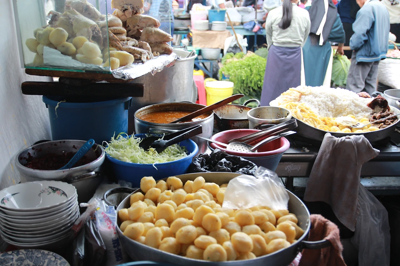 에콰도르에 도착하자마자 알무에르소(Almuerzo)를 접했다. 알무에르소는 '점심식사' '점식세트메뉴'라는 뜻으로 수프와 메인 요리, 주스가 함께 나온다. 마치 우리나라 한 끼 식사인 백반 같다. 처음으로 먹은 알무에르소는 오타발로 가축시장에서였다. 쌀밥과 함께 닭고기, 돼지고기, 소고기를 선택할 수 있고 야채와 감자 등이 곁들여진다. 시장에서 먹은 이 알무에르소는 단돈 1달러! 낯선 나라에서 첫끼가 1달러라니, 환호와 함께 한 숟가락 크게 떴다.