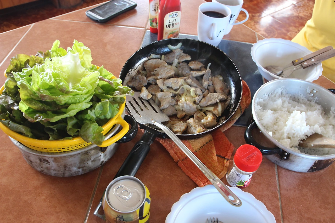 첫째, 1만6000km 떨어진 곳에서 우리나라 음식인 삼겹살을 해 먹어 보자! 이스터섬 내 시장에는 대부분 소고기 밖에 없었다. 간신히 돼지고기를 구했고 상추 비슷한 쌈을 사 와서 삼겹살을 해 먹었다. 삼겹살을 구운 게 아니라 거의 만들었다. 외국인들이 무슨 요리냐며 물어볼 때마다 한국음식이라고 소개했다. 어떻게 이곳에서 한국음식을 먹을 수 있냐고 놀랄 뿐.