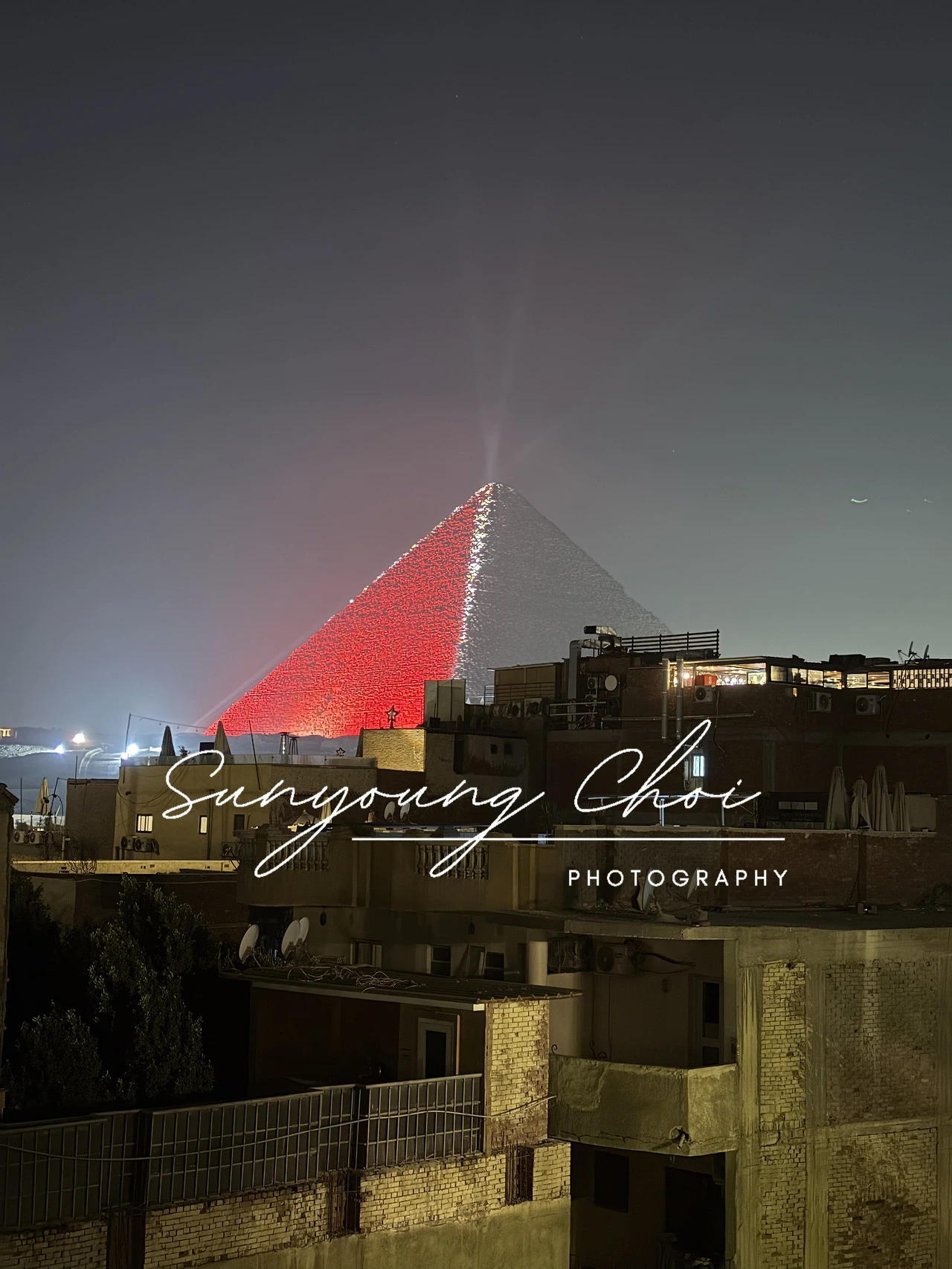 조그마한 발코니에 발을 내딛는 순간, 눈앞에 펼쳐진 건 거대한 피라미드 세 개의 장엄한 풍경. 레이저의 붉은빛을 삼각 면 중 하나에만 받아 이 세상의 것이라기보단 외계의 그 무엇 같다. 창 밖으로 낙타 똥이 굴러다니는 지저분한 골목과 어지러운 세상과는 전혀 어울리지 않는 찬란한 고대의 유적. 마치 화성에 외따로 떨어진 것 같은 착각마저 불러일으킨다. 수천 년의 세월을 뛰어넘은 진짜 유적이 가진 힘은, 정말이지 압도적이다.