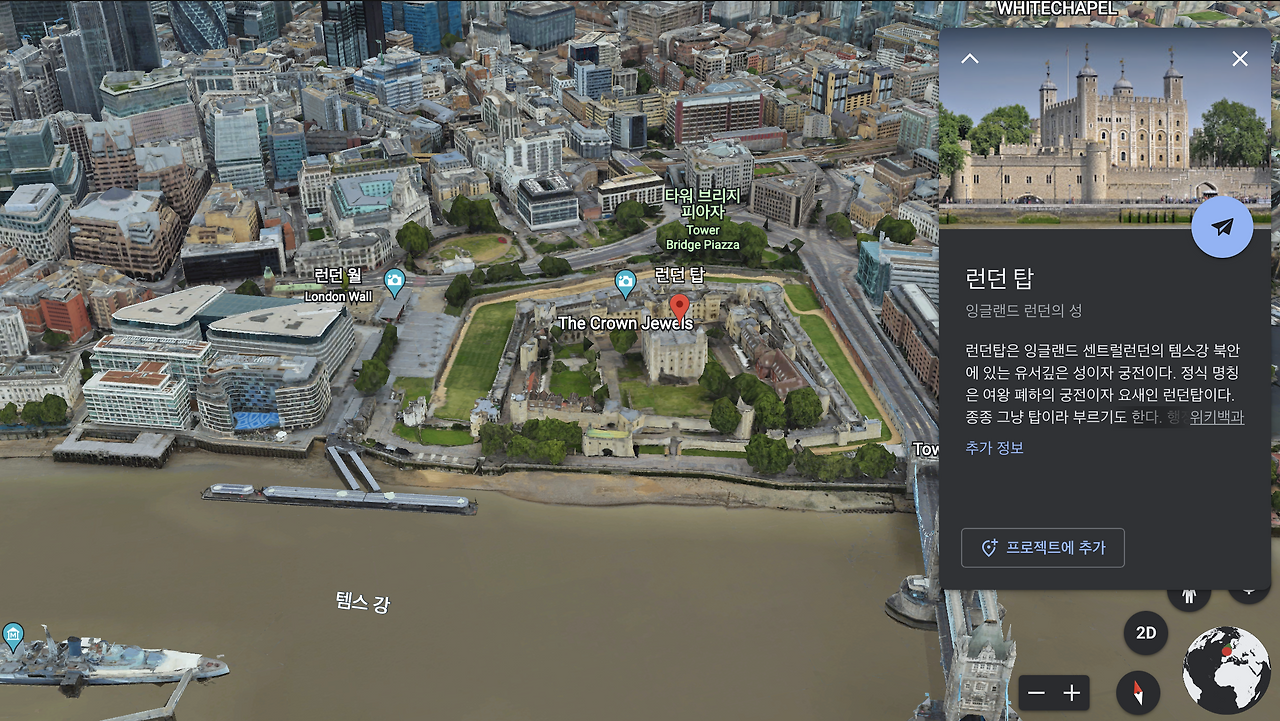 구글 어스를 실행하고 나면 여행하는 방법은 민망할 정도로 쉬운 편이다. 먼저 좌측에 보이는 돋보기 아이콘을 클릭해, 꼭 가보고 싶었던 여행지나 관광 스폿을 입력해보도록 하자. 영국 음식을 맛본 뒤이니만큼, 나는 타워 오브 런던(Tower of London, 런던탑)을 타이핑해 보았다.