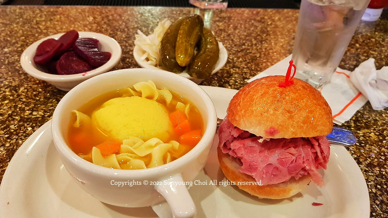 오바마가 최고의 치즈케이크라고 극찬을 마지않던 디저트가 시그니처 메뉴인 뉴욕 브루클린의 한 다이너. 1950년에 문을 열어 빨강과 흰색이 교차되는 강렬한 레트로 분위기가 매력적인 카운터에서 앉아 홀로 마초 볼 수프를 주문한다. 닭 육수에 계란, 빵가루, 치킨 지방으로 반죽된 커다란 공(matzo ball)이 동동 떠 있는 이 독특한 수프는 아슈케나지 유태인들의 전통 음식이기도 하다. 진한 닭고기 국물이 배어든 수프를 홀짝이며, 미국식 다이너는 혼밥을 하기 최적의 장소가 아닐까 하고 생각해본다. 다이너마다 있기 마련인 주방과 손님들 부스의 경계인 카운터에는 혼밥러에 딱인 1인용 의자들이 옹기종기 놓여 있는 모습을 어렵지 않게 볼 수 있다.